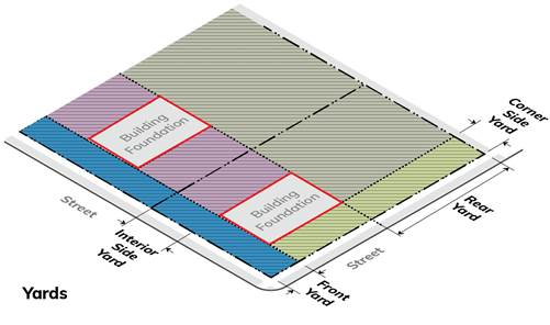 Corner side yard. A corner side yard is located between a principal building line and the corner side lot line. The corner side yard extends along the corner side lot line between the front yard and the rear yard, measured perpendicular to the corner side lot line.