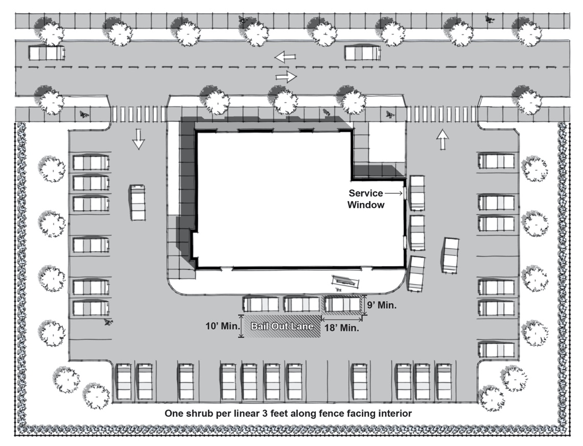 Each drive-thru lane must have a bailout capability for all vehicles that enter. The bailout lane must be a minimum ten (10) feet in width and run parallel to the drive-thru lane. If a bailout lane is also an interior drive providing access to parking spaces, the bailout lane is limited to a one-way traffic pattern following the direction of the drive-thru lane.