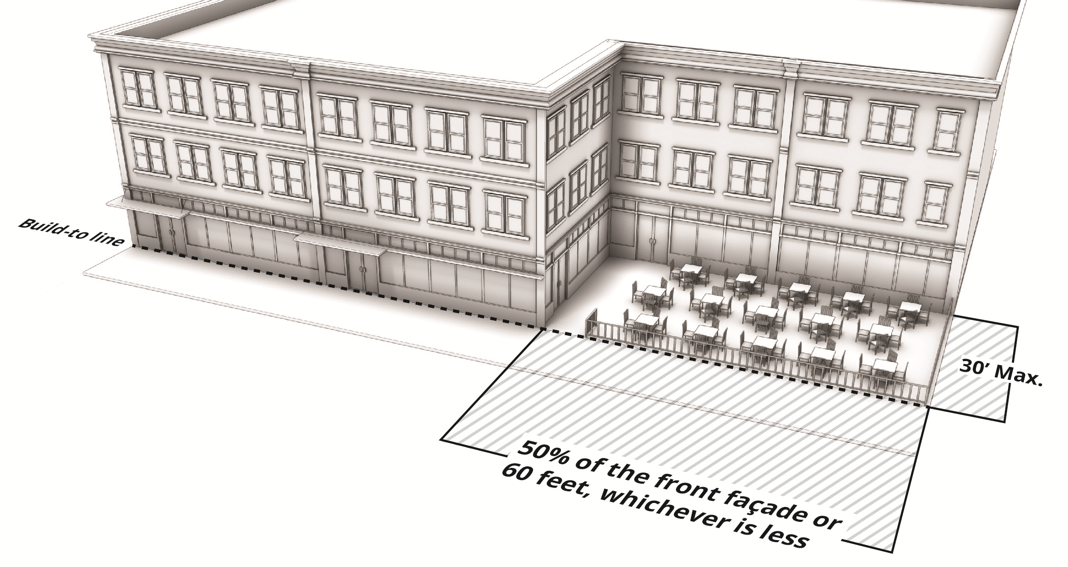 When a structure is required to be constructed at a build-to line, the structure may have up to fifty (50) percent or sixty (60) linear feet of the applicable façade, whichever is less, designated as outdoor dining may be setback up to thirty (30) feet from the required build-to line.