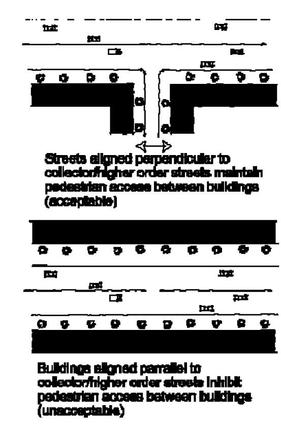 Buildings must not be oriented such that the loading areas, rear, or unfinished portion of the façade faces the local streets or the collector or higher order streets.