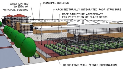 If covered, the display area shall be covered with a roof structure that is architecturally integrated into the principal building, except that nursery areas may be covered by greenhouse roofing, screening, or another cover material that is appropriate for protecting plant stock;