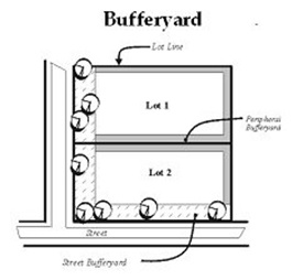 Bufferyard. A strip of land together with open spaces, landscaped areas, fences, walls, berms, or any combination thereof required thereon located between different land uses or zoning districts. or along streets to minimize potential nuisances such as dirt, litter, noise, glare of lights, signs and unsightly buildings, and parking lots, or to provide spacing to reduce adverse impacts of noise, light, or other nuisance. See Figure B-2, Bufferyards.
