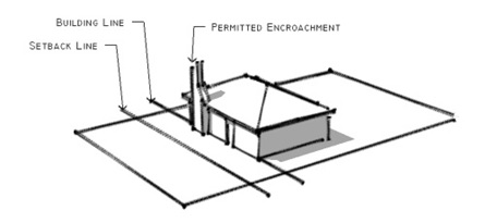 Building Line. A line that is parallel to a lot line, which runs through the point of the building that is closest to the lot line, excluding portions of the building that are permitted encroachments. The building line may or may not be contiguous with the setback line. See Figure B-4, Building Line.