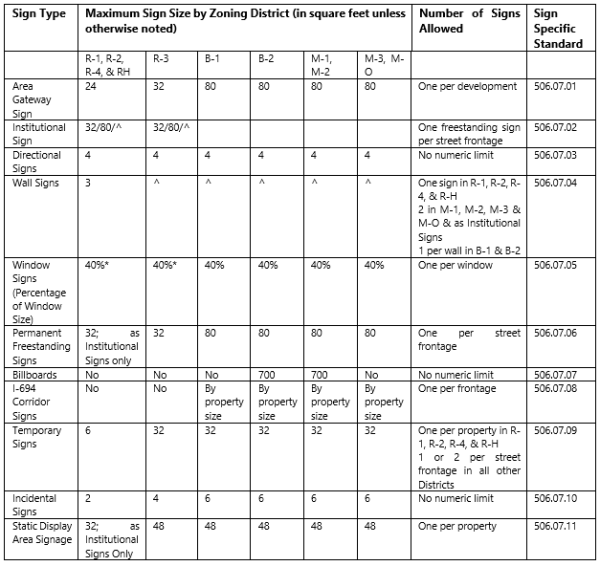 (1) A manual changeable message may comprise up to 50% of the static display area signage. (2) Signs may not include an electronic changeable message. (3) Signs may not be internally illuminated. (4) A maximum height of six feet for freestanding static display area signage. (5) A maximum size of 32 square feet in the R-1, R-2, R-4, and R-H Districts and 48 square feet in all other Districts. (6) One static display area signage installation is allowed per street frontage. (7) Legal nonconforming real estate signs and construction signs established prior to the effective date of this Chapter will be included in a property’s allowance for static display area signs. (8) Static display area signage will be allowed in addition to other freestanding or wall signs for a property.