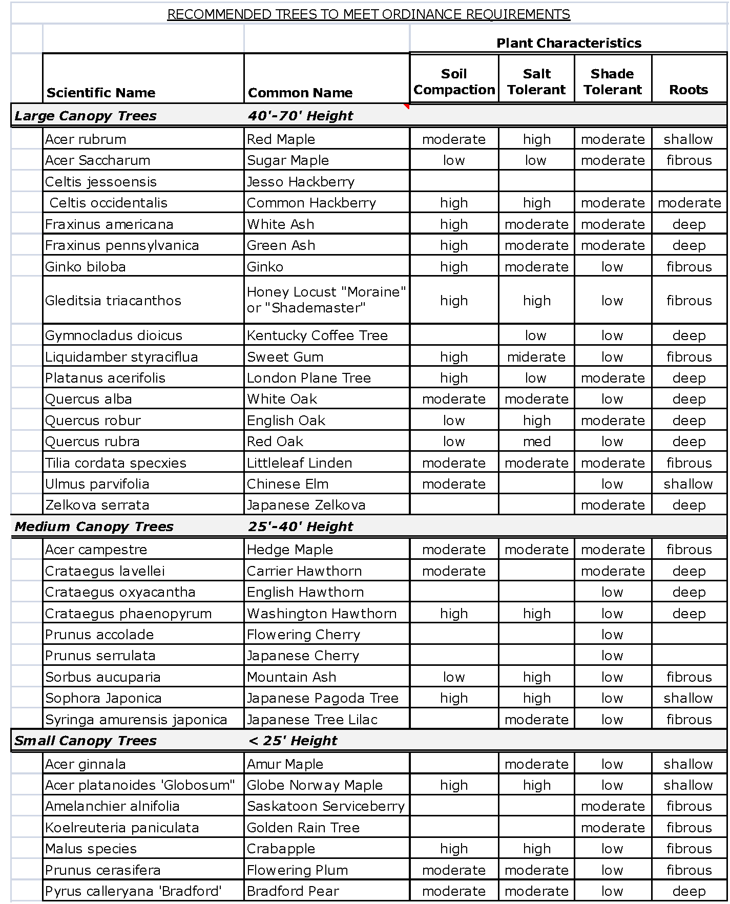 Selected based on minimum tree lawn (the area between the curb and the sidewalk) requirement: