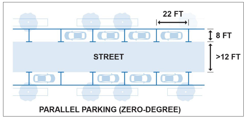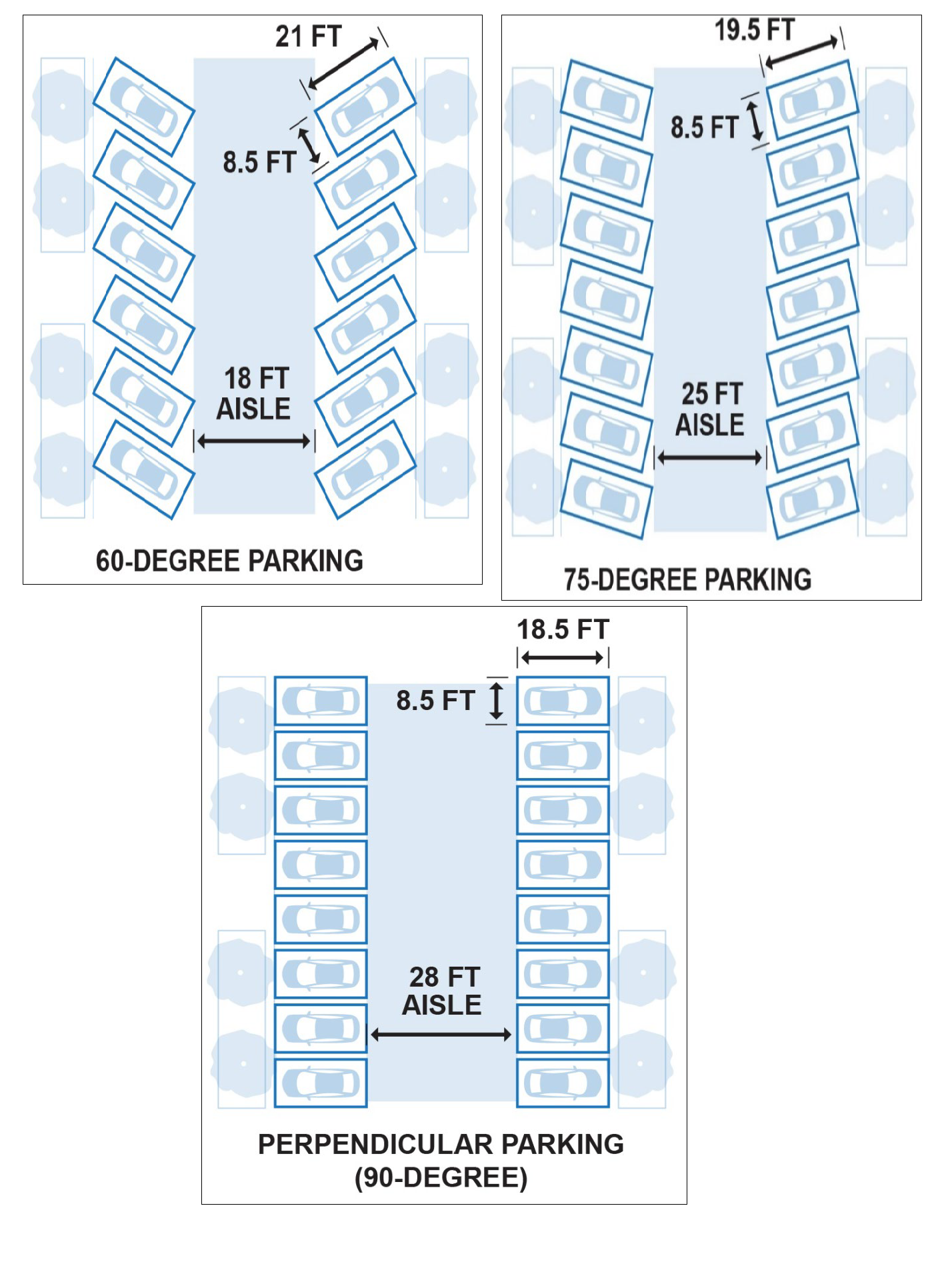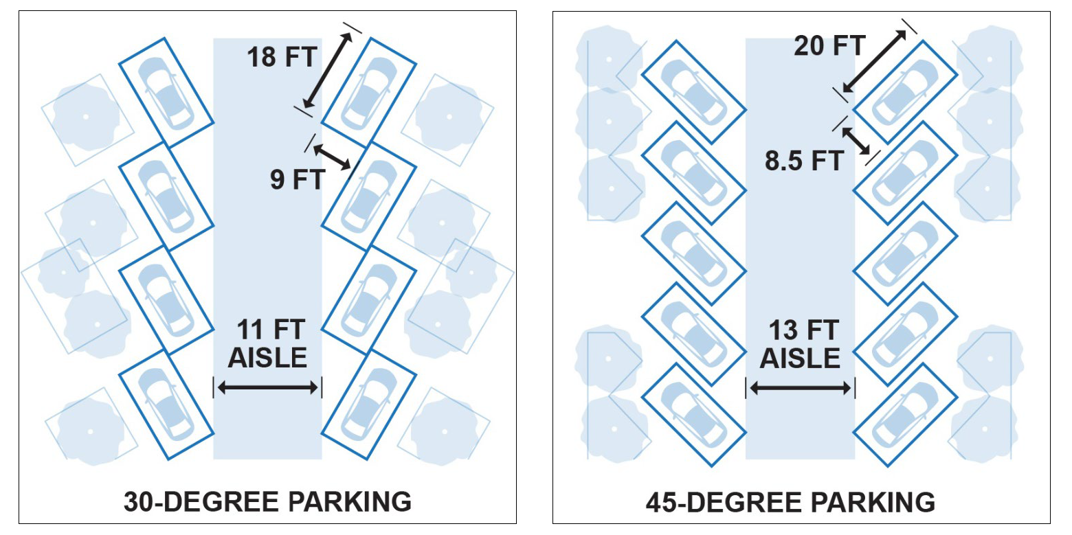 Parking Area Layout. The dimensions of required off-street parking areas shall comply with the standards shown in the following parking dimensions table.