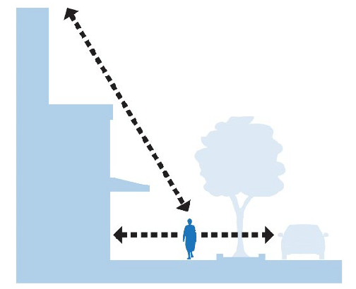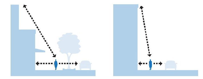 [Building height and articulated facades should create a sense of street enclosure at a human scale.]