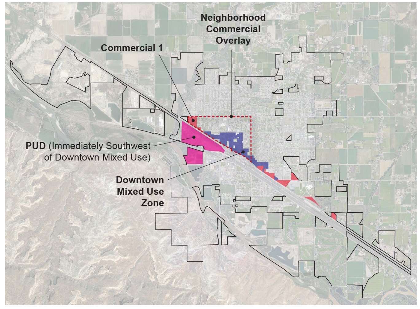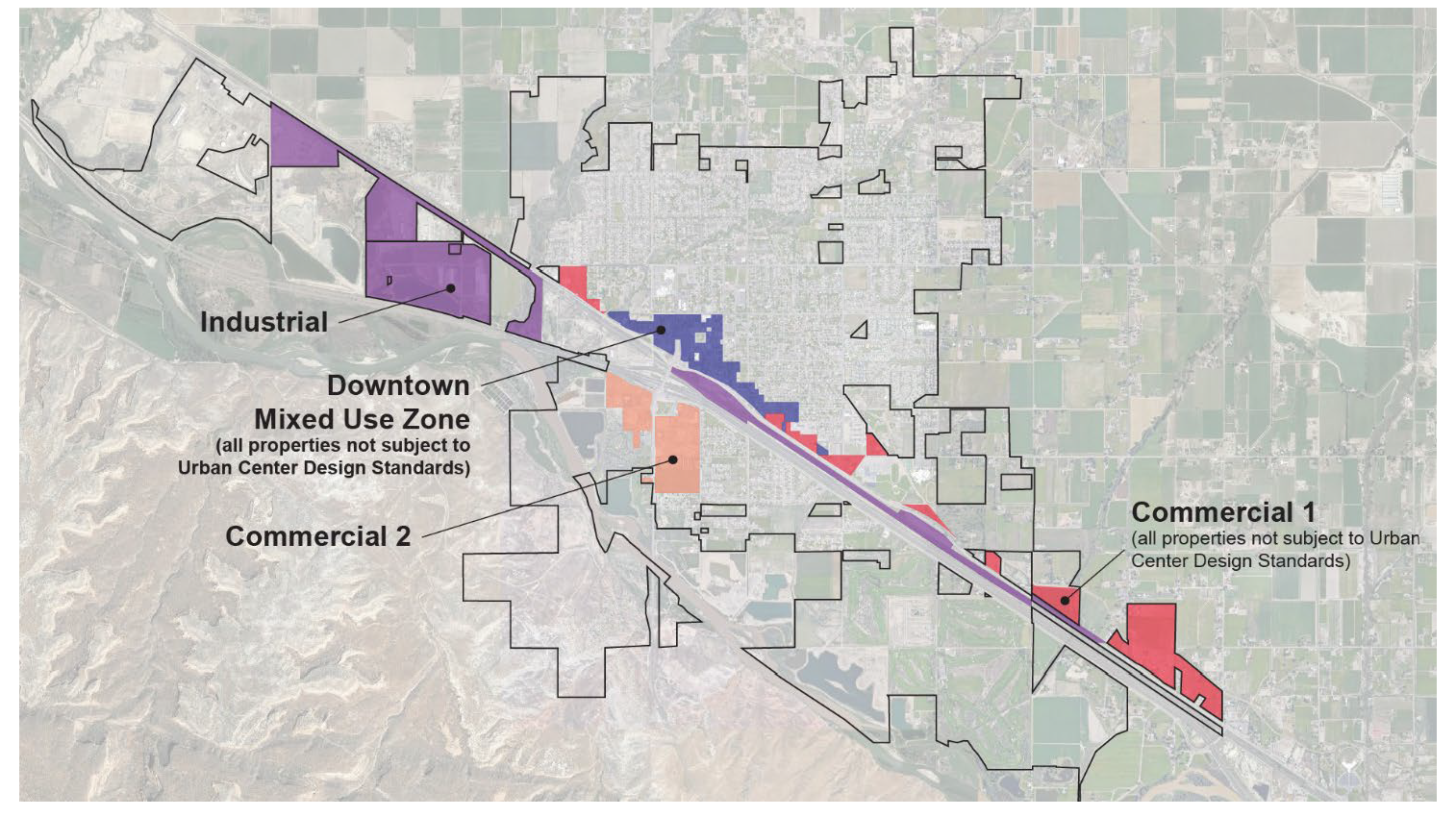 The zone districts subject to the Business Design Standards are also illustrated in the map below.