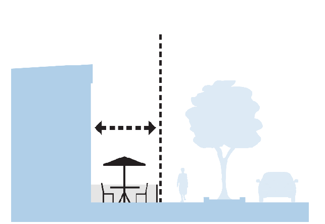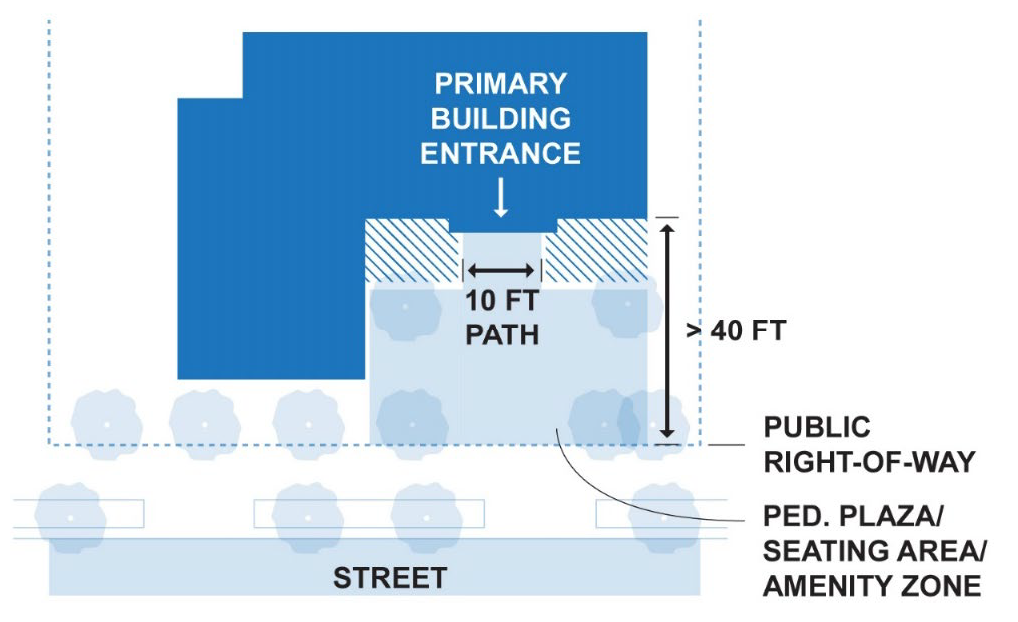 Primary building entrances located more than forty (40) feet from the public street right-of-way or public sidewalk will require a pedestrian plaza/outdoor seating area, courtyard, or other civic amenity is provided between the building and street.