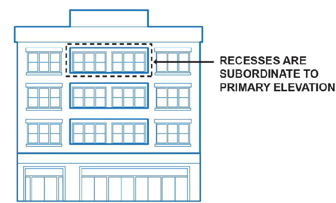 [Changes in plane may include but are not limited to recessed entries, bays, stepped parapets, secondary roof forms (e.g., gables, lower roof sheds, dormers and towers), building bases, canopies, awnings, projections, recesses, alcoves, pergolas, porticos, roof overhangs, columns, or other features that are consistent with the overall composition of the building.]