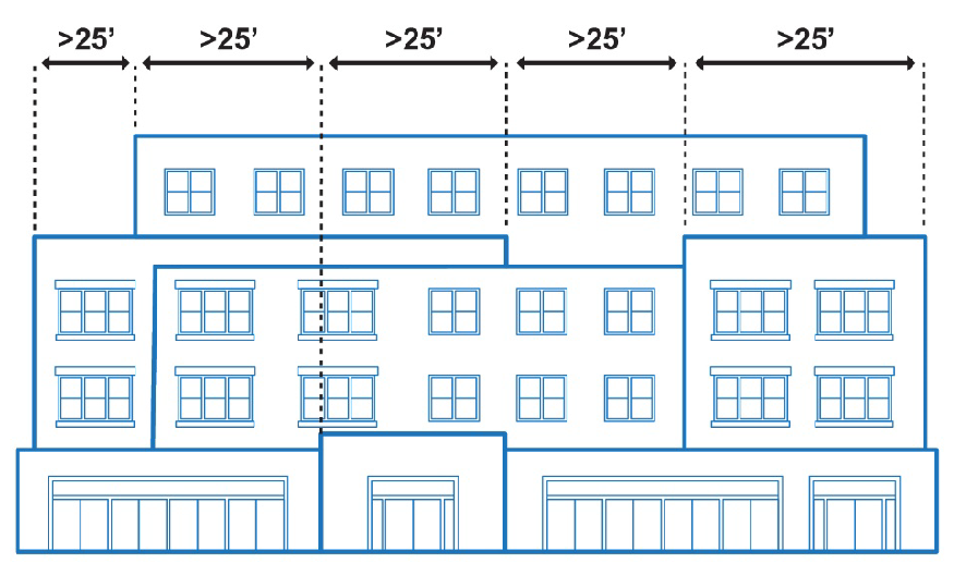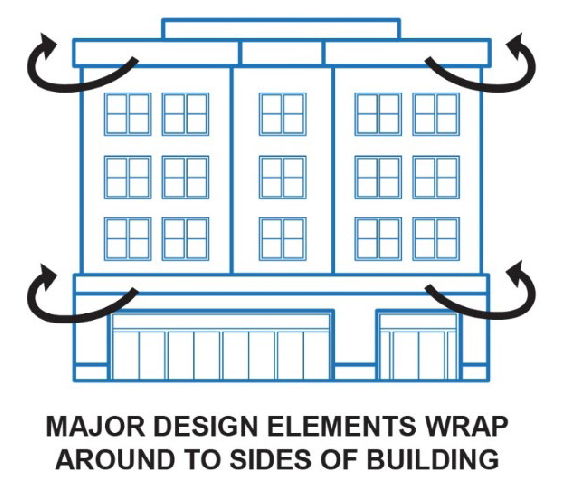 Traditional Lot and Building Pattern. Buildings must respect the traditional lot pattern and building rhythm of the downtown and/or adjacent residential neighborhood, as applicable, by incorporating rhythmic divisions in all elevations. [As a general guideline, front elevations should be articulated not less than once every twenty-five (25) feet. Articulation should be subtle. For example, slight offsets in a building elevation, roofline and/or the rhythmic placement of windows, pilasters, awnings, trim, art/medallions, or other detailing and ornamentation are preferred. Abrupt divisions, such as clashing paint colors, should be avoided. Side and rear elevations may be articulated less frequently but should complement the overall building design. The City may require detailing on a zero-lot line elevation to reduce the apparent scale and avoid blank walls (i.e., until an abutting property develops).]