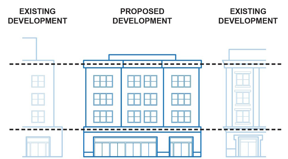 Exceptions: Where existing buildings do not meet the City's current architectural standards, a new building may establish new horizontal lines.