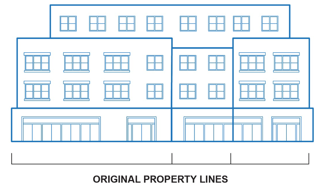 Vertical Rhythms. New construction or front elevation remodels shall reflect a vertical orientation, either through breaks in volume or the use of surface details, to divide large walls, so as to reflect the underlying historic property lines, as applicable.