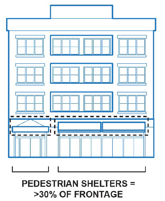 Awnings, canopies, recesses or similar pedestrian shelters shall be provided along at least thirty (30) percent of a building's ground floor elevation(s) where the building abuts a sidewalk, civic space (e.g., plaza), pedestrian access way, or outdoor seating area. Pedestrian shelters used to meet the above standard shall extend at least five (5) feet over the pedestrian area, be proportionate to the building in its dimensions, and not obscure the building's architectural details. Pedestrian shelters shall align with one another to the extent practical. [Use of colored canvas (not plastic) awnings and wood canopies, consistent with historical styles, is encouraged, though metal and plexi-glass canopies may be considered.]