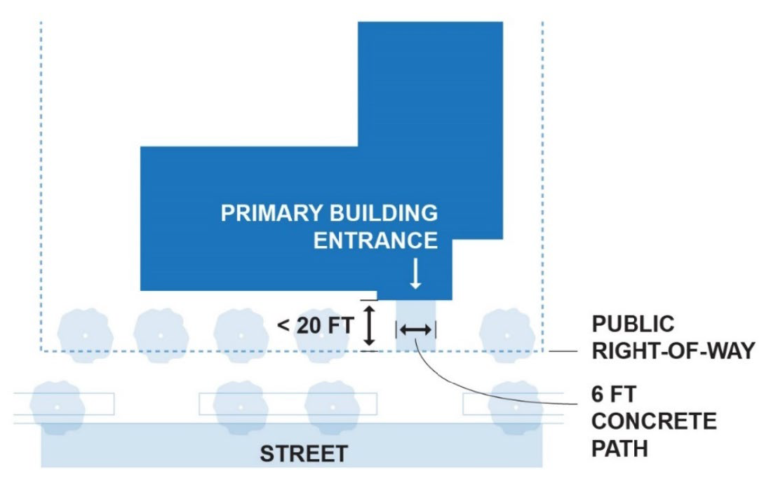 Primary building entrances shall be oriented to the public street right-of-way and/or public sidewalk and shall be connected to the public street right-of-way and/or public sidewalk by a concrete walkway not less than six (6) feet in width. Primary building entrances shall be within twenty (20) feet of the public street right-of-way and/or public sidewalk.