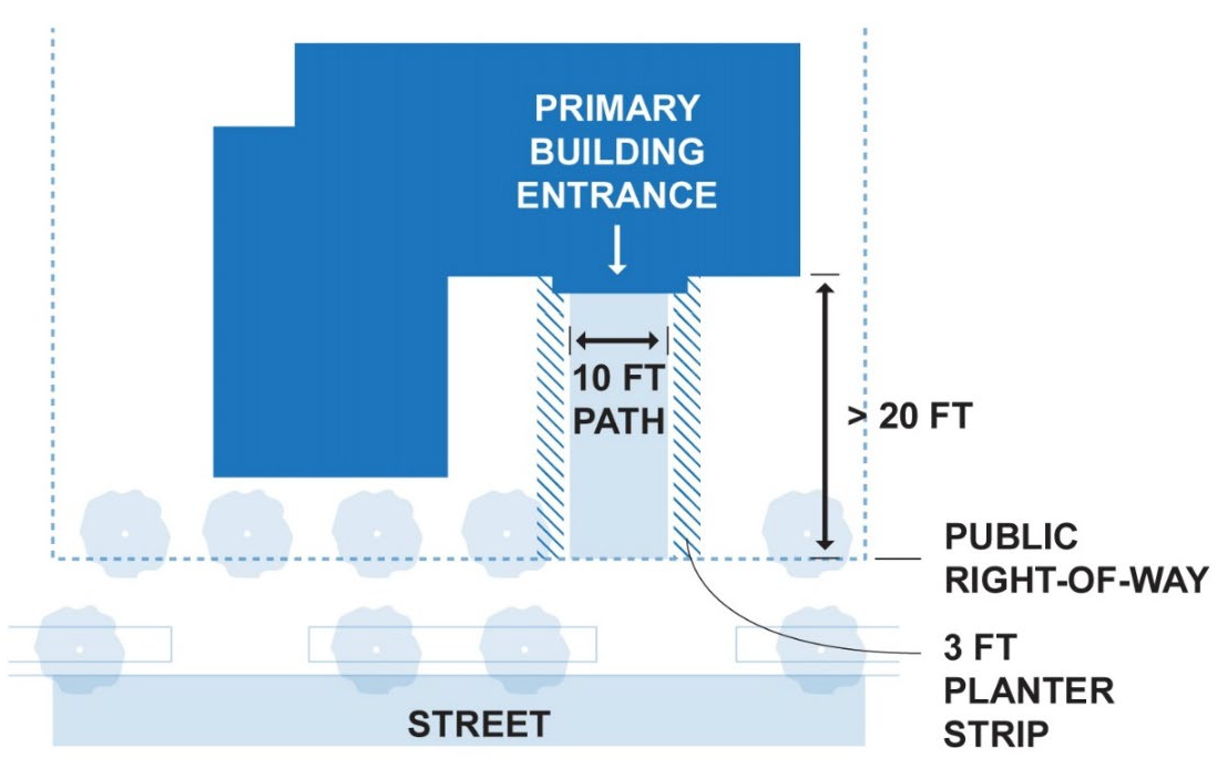 Where it is not practical to locate primary building entrances within twenty (20) feet of the public street right-of-way or public sidewalk, the concrete walkway connecting primary building entrances to the public sidewalk or public street right-of-way shall be no less than ten (10) feet in width. This concrete walkway must have three (3) foot wide planter strips on each side and raised or textured paving at all driveway crossings.