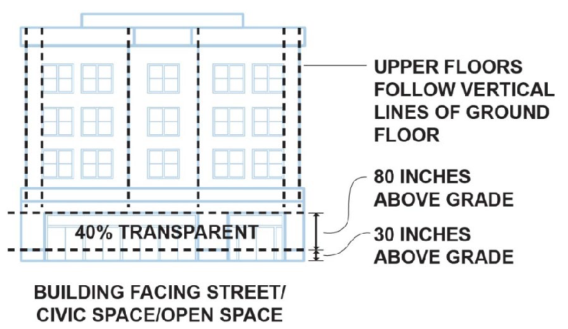 Building elevations that face a street, parking area, civic space, or open space shall comprise at least forty (40) percent transparent windows, measured as a section extending the width of the street-facing elevation between the building base (or thirty (30) inches above the sidewalk grade, whichever is less) and a plane eighty (80) inches above the sidewalk grade. Upper floors may have less window area, but should follow the vertical lines of the lower level piers and the horizontal definition of spandrels and any cornices.