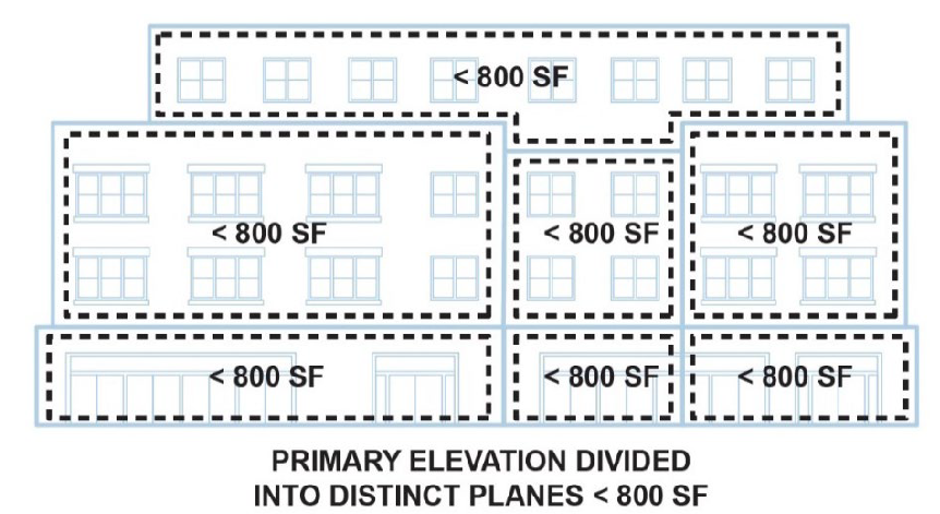When an elevation of a primary structure is more than eight hundred (800) square feet in area, the elevation must be divided into distinct planes of not more than eight hundred (800) square feet. For the purpose of this standard, areas of wall planes that are entirely separated from other wall planes are those that result in a change in plane such as a recessed or projecting section of the structure that projects or recedes at least one (1) foot from the adjacent plane, for a length of at least six (6) feet.