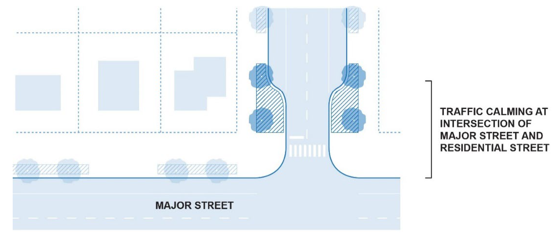 Street Design. Street and alley networks, as applicable, shall, to the maximum extent practical, be configured to minimize cut-through traffic on local residential streets without relying upon the use of culs-de-sac; where cut-through traffic is unavoidable, street design shall incorporate neighborhood traffic calming features, such as curb extensions (reduced width at intersections), roundabouts at major intersections, traffic circles, or other features, consistent with the City of Fruita Street System Design Criteria and the City of Fruita Traffic Calming, Pedestrian and Bicycle Plan.