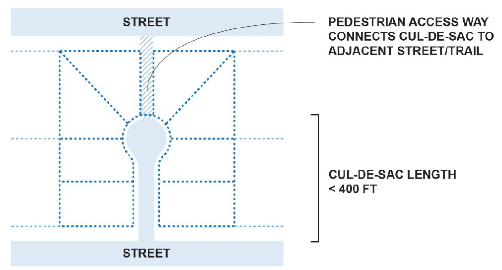 Culs-de-sac, where allowed, are limited to a maximum length of four hundred (400) feet. A pedestrian access way or trail will be required to connect the end of any cul-de-sac to an adjacent street or trail right-of-way to minimize out-of-direction travel by pedestrians and bicyclists. The City decision-making body may also require the use of pervious paving (e.g., pavers) or stamped concrete on culs-de-sac to minimize stormwater runoff (impervious surfaces) or to identify culs-de-sac as community spaces where children play (e.g., basketball hoops, street hockey, etc.).