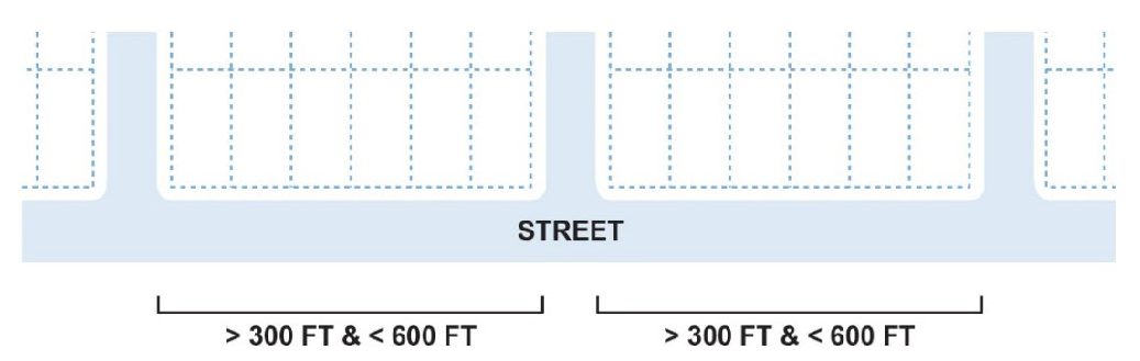 Block Lengths. Block lengths shall provide for at least one street connection for every three to six hundred (300 to 600) feet maximum in block length, except where topographic or access restrictions (e.g., arterial intersection spacing) preclude such connections. Where street connections are not feasible, pedestrian and bicycle pathway/trail connections shall be used to make walking and bicycling within and between developments convenient.