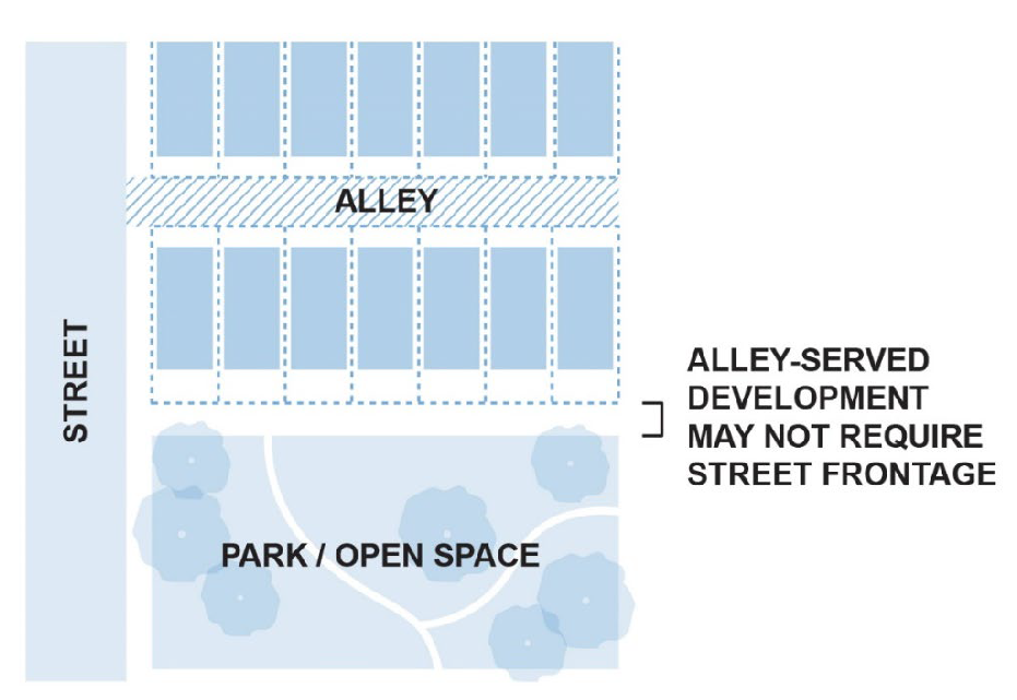 Alleys and Shared Driveways.[Alleys or shared driveways are encouraged in new subdivisions and in redevelopment projects where the subject block has, or historically had, an alley.] Alleys and shared driveways allow homes to front onto parks and open space areas without a road separating the homes from such features. Alleys can also provide additional off-street parking where needed. Finally, alleys can provide effective land use and density transitions in the middle of a block instead of along street frontages, where it is more desirable to have similar building types face one another.