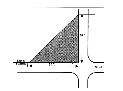 Sight distance triangle: The area bounded by the street right-of-way lines of corner lots and a line joining points along said street lines at a distance of 30 feet from their points of intersection, unless otherwise determined by the director or public works based upon standards published by the American Association of State Highway and Transportation Officials (AASHTO). Sight distance triangles are also applicable to driveways serving development off collector and arterial roadways.