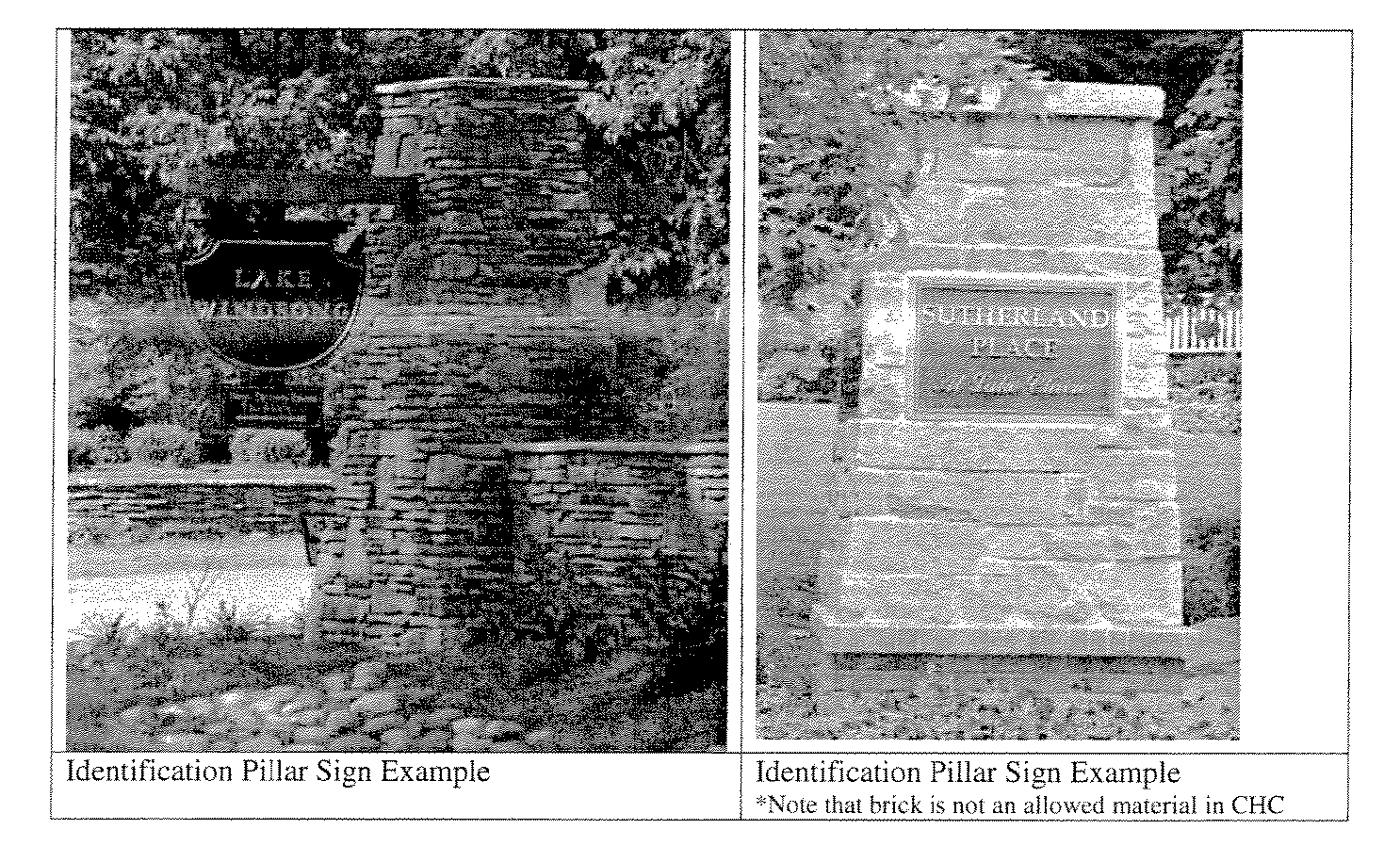 Identification pillar sign faces shall be constructed of natural stone, metal, wood or materials designed to have the appearance of natural wood. Plastic inserts are not allowed.