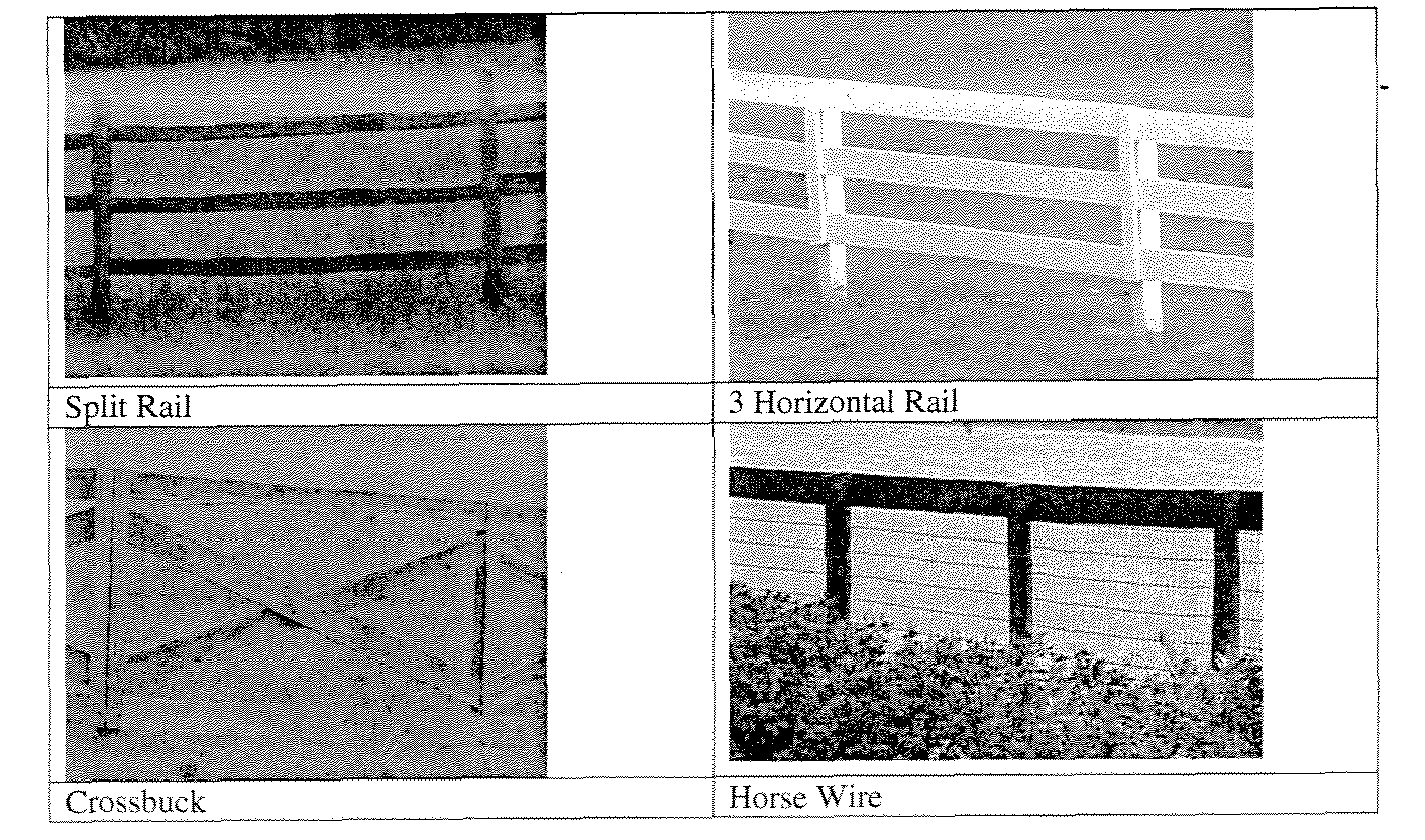 Allowable fencing types: split rail, 3-4 horizontal rail, crossbuck and horse wire (see examples below) or combination thereof.