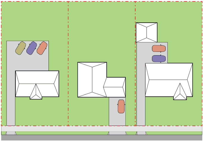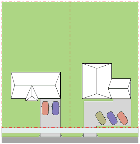 The above image shows driveways. Each path is no more than 18 feet in width and provide a vehicular path from the street to a private garage or to the area to the side or rear of the principal structure. The left and the right lots show driveways that, to the rear of the principal structure, are wider than 18 feet, at which point the vehicle use area is considered a parking area, not a driveway.