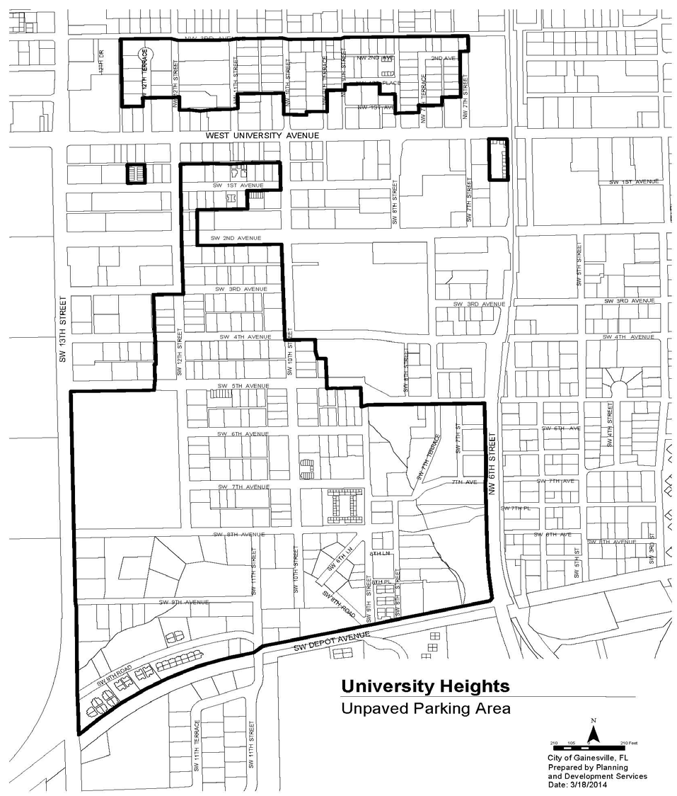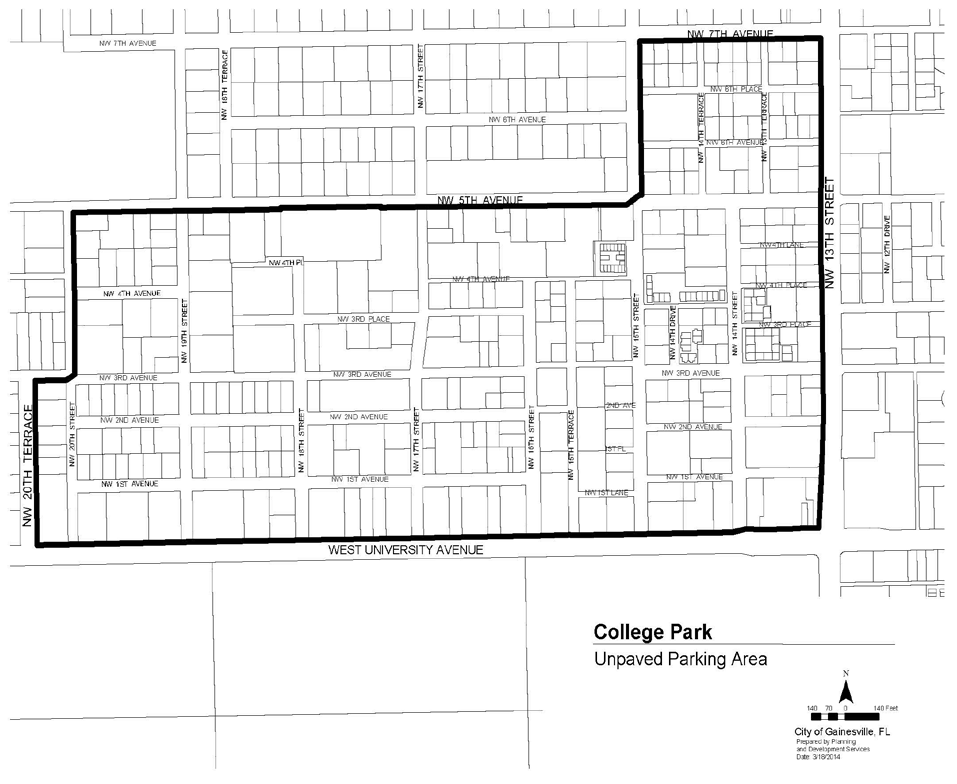College Park/University Heights Unpaved Parking Overlay. With the exception of any properties that are regulated by subsection A. above, off-street unpaved parking within the College Park and University Heights areas as depicted in Figures V-18 and V-19 below shall be subject to the following regulations.