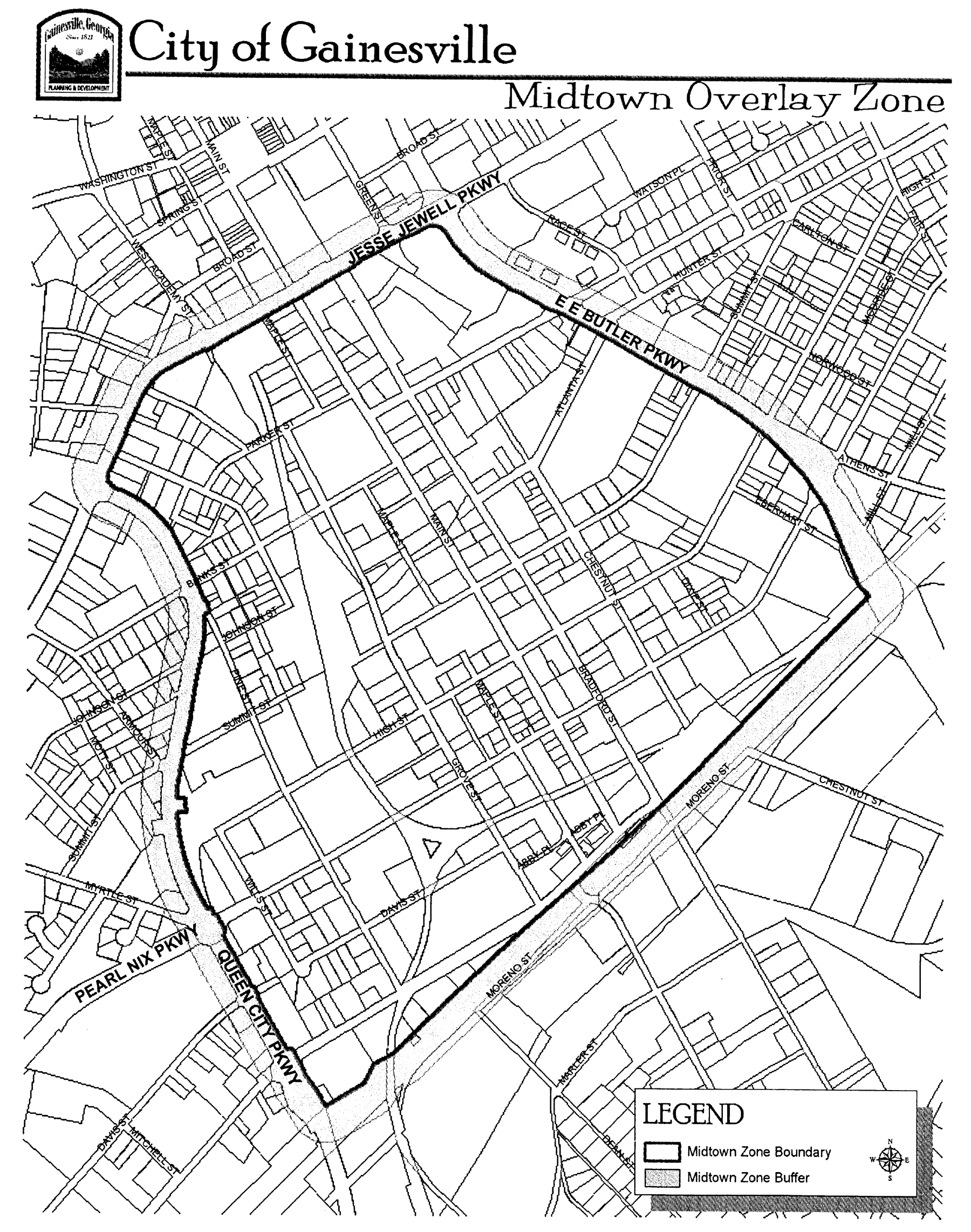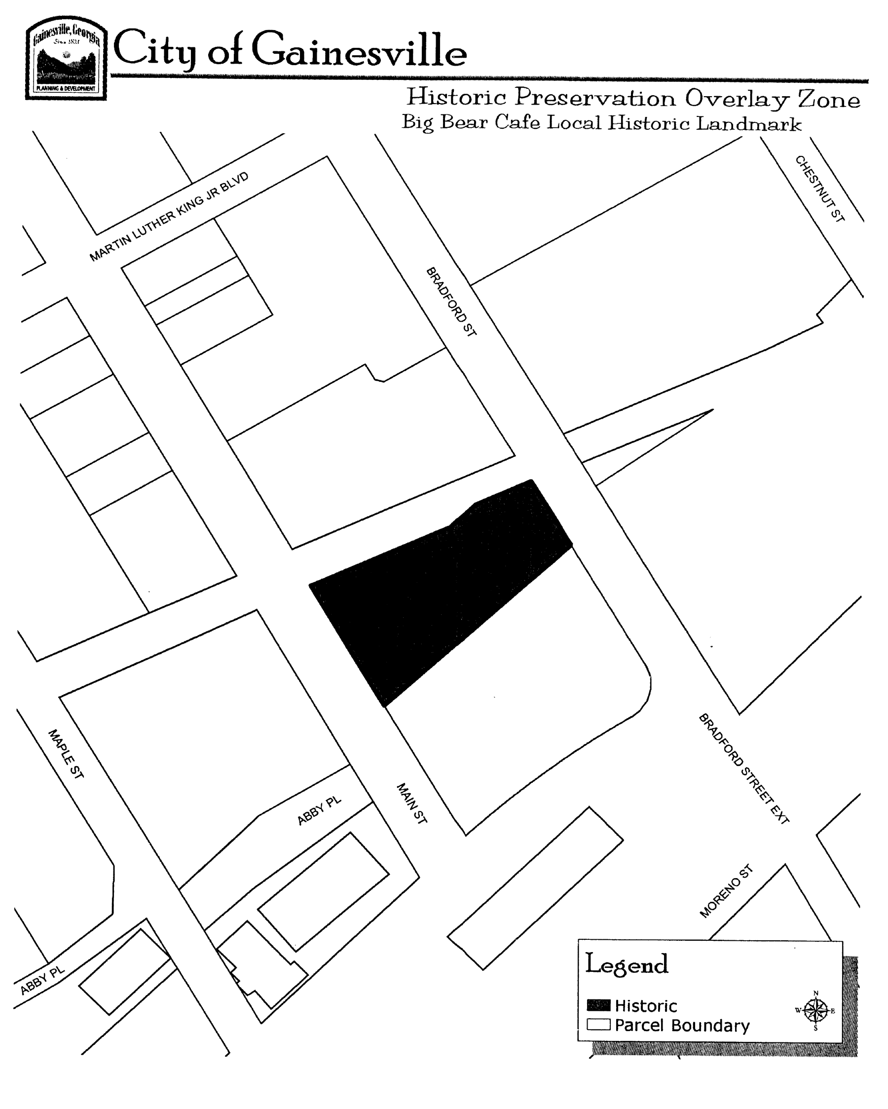 Boundaries. The subject property is bounded by Main Street, Bradford Street, a spur track of the CSX Railroad (formerly the Gainesville-Midland Railroad) which is no longer in use and property of the Norfolk Southern Railroad. More specifically, the boundary of the local historic landmark follows the property lines of the subject tract as described in the recorded deed and as shown on a recorded plat.