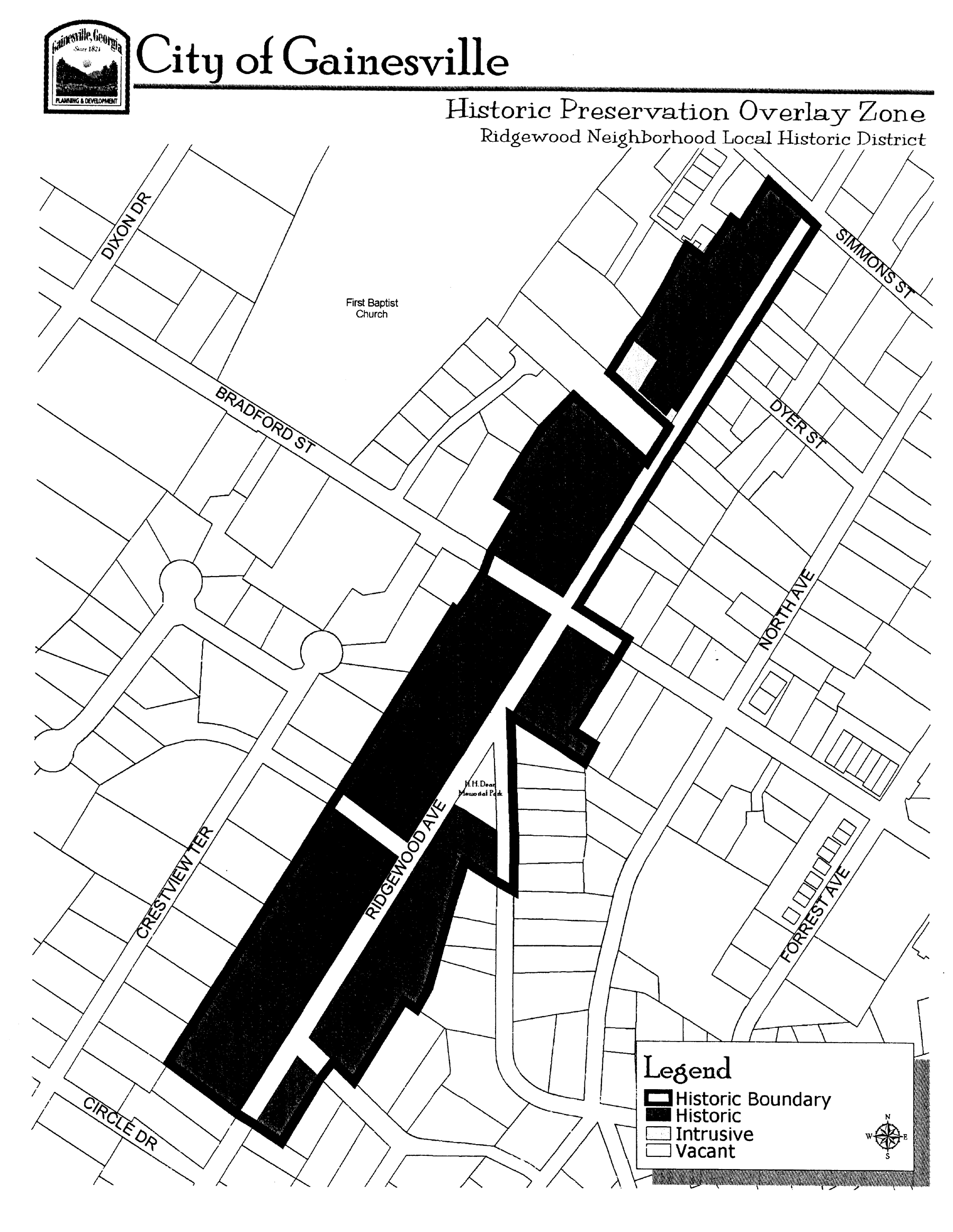 Boundaries. The Ridgewood Neighborhood Local Historic District, which consists of residential structures that are predominantly owner-occupied, single-family homes; is located north of the central business district within the neighborhood conservation (N-C) zoning district along Ridgewood Avenue and includes 48 contiguous properties situated along Ridgewood Avenue, Denton Drive and Bradford Street.