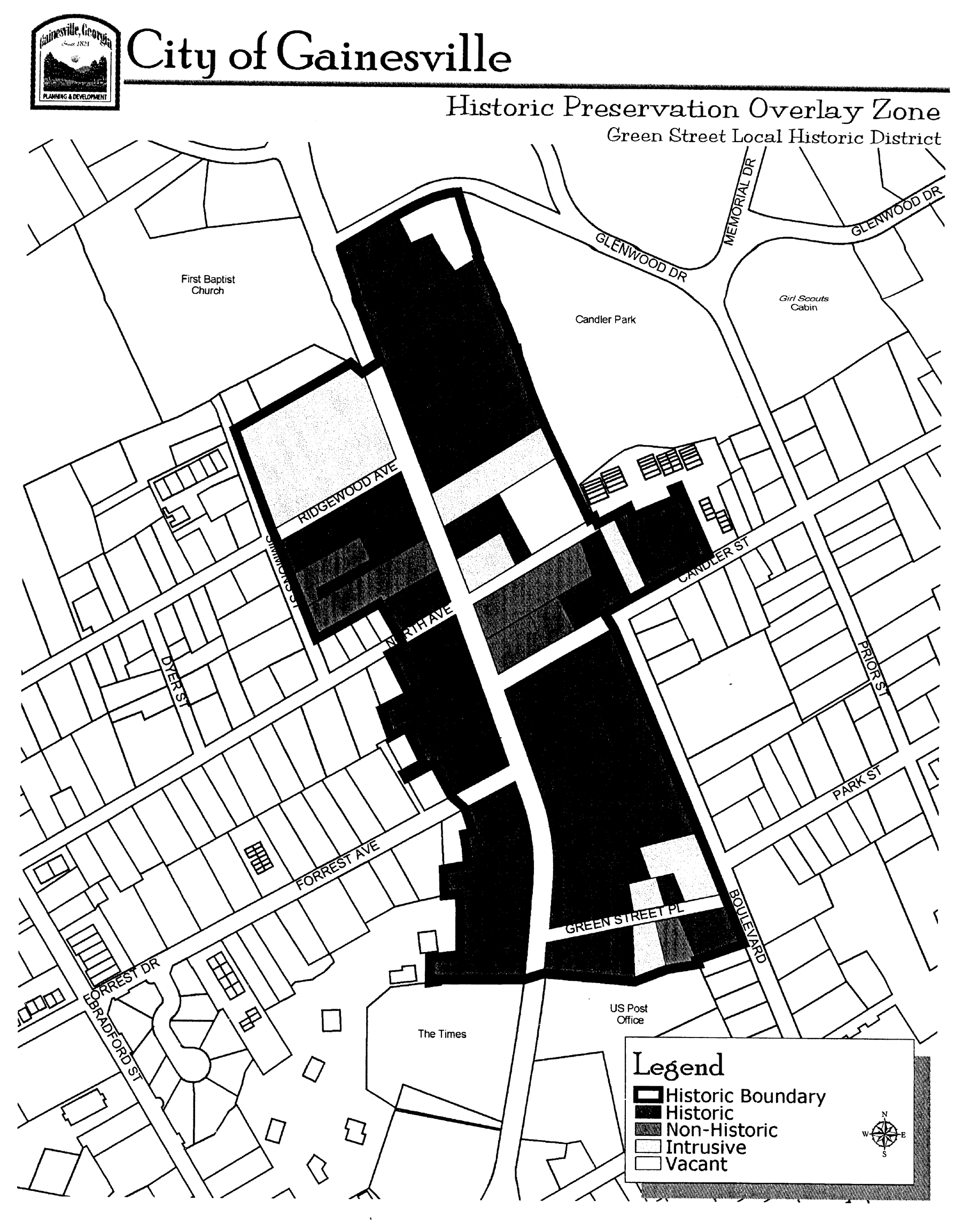 Boundaries. The boundaries of the Green Street Local Historic District closely follow the boundary of the Green Street Historic District as listed in the National Register of Historic Places in 1975, and predominantly encompass properties fronting Green Street. This area also was included in an updated National Register nomination listed in 1985. Such nomination combined the existing 1975 Green Street and 1978 Brenau College National Register Historic Districts as well as encompassed adjacent historic neighborhoods to create one comprehensive district: the Green Street-Brenau-Green Street Circle Historic District.