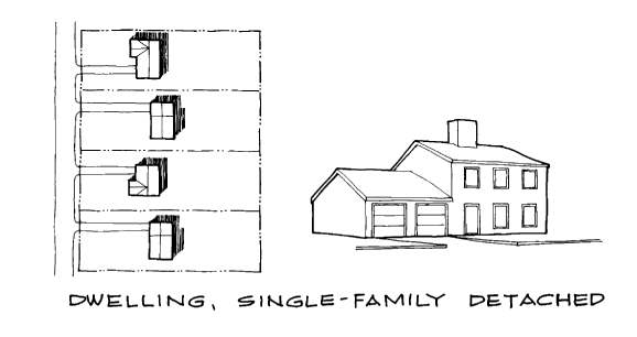 | Dwelling, single-family, detached, fee-simple | ![]() | Dwelling, single-family, detached, fee-simple: A site-built residential building, or a single-family residential industrialized building designed for occupancy by one family only, where each dwelling is located on its own lot. The term "dwelling, single-family, detached, fee-simple," does not include manufactured homes or mobile homes. |