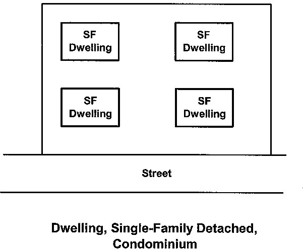 | Dwelling, single-family, detached, condominium | ![]() | Dwelling, single-family, detached, condominium: A site-built residential building, or residential industrialized building designed for occupancy by one family only, where more than one dwelling is located on a single lot and the land is owned in common. The term "dwelling, single-family, detached, condominium," does not include manufactured homes or mobile homes. |