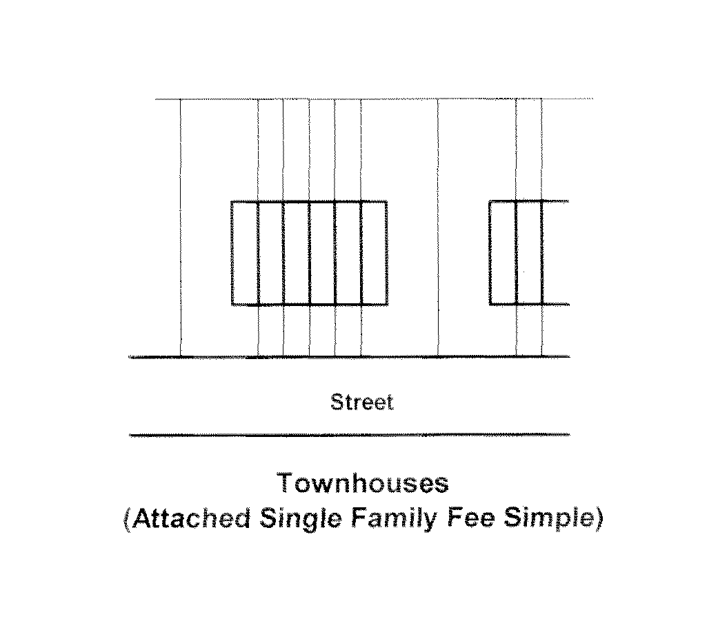 | Dwelling, single-family, attached (townhouse) | ![]() | Dwelling, single-family attached, fee-simple (townhouse): One of a group of three or more single-family, attached dwelling units under fee-simple ownership. Attached single-family dwellings that are not under fee-simple ownership are considered row houses (multifamily dwellings). |
