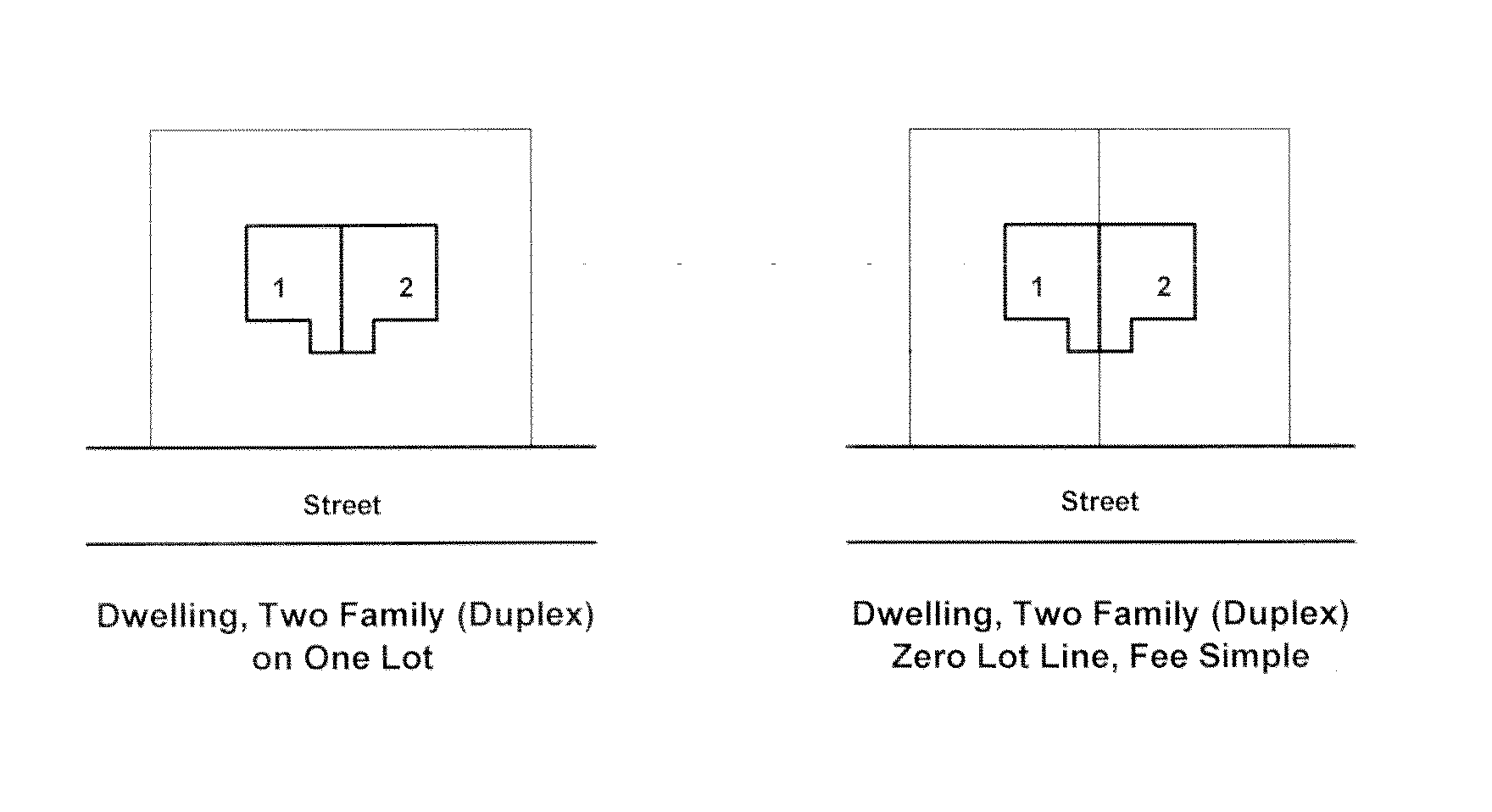 | Dwelling, two-family (duplex) | ![]() | Dwelling, two-family (duplex): A building designed or arranged to be occupied by two families living independently of each other. The building contains two dwelling units either on one lot, or, each dwelling is located on its own lot in fee-simple title and the two dwelling units are attached along a common property line. |