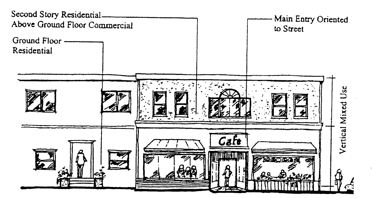 Mixed-use developments typically consist of two or more different land uses in the same building. The term "mixed-use development" specifically includes live-work units and other mixtures of residential use with office, retail, service, or institutional uses. Mixed-use developments have a pedestrian friendly character (e.g., with a storefront or village design).