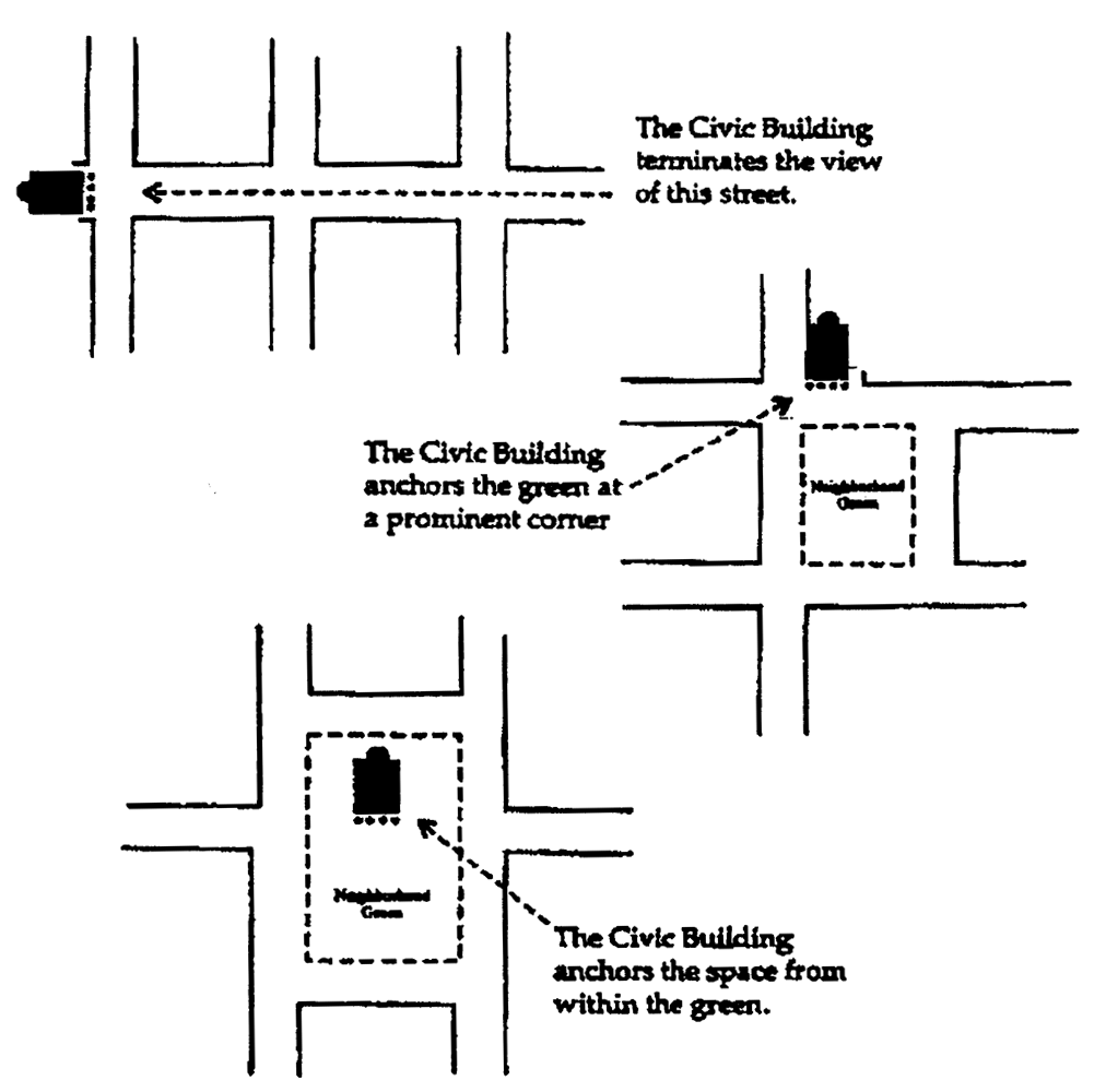 Civic and institutional uses. Sites for churches, schools, community or club buildings, and similar public or semi-public facilities are encouraged to be provided, where appropriate. Uses such as schools, churches, and other institutions where provided should be part of an integrated site design and located and designed to minimize negative impacts.