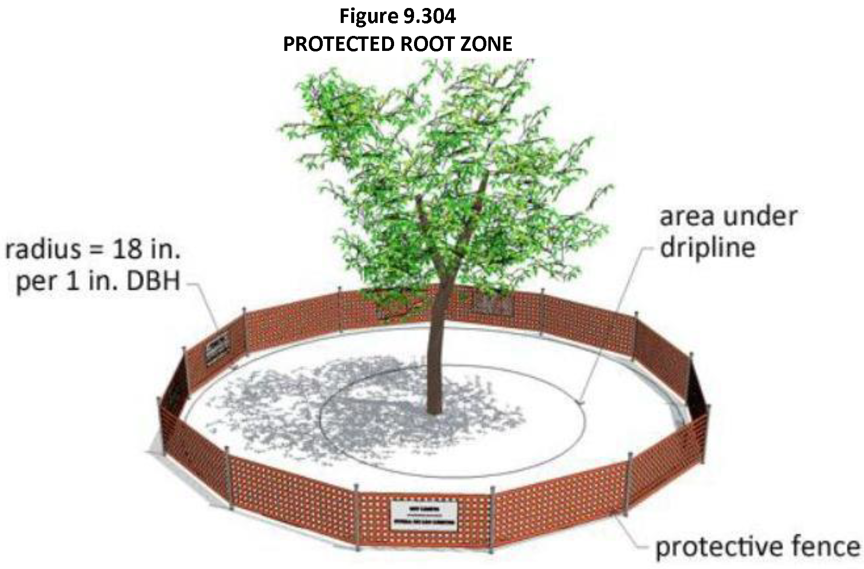 A radius that extends from the center of the trunk 18 inches per each 1 inch of diameter at breast height (DBH) of the protected tree. See Figure 9.304, Protected Root Zone.