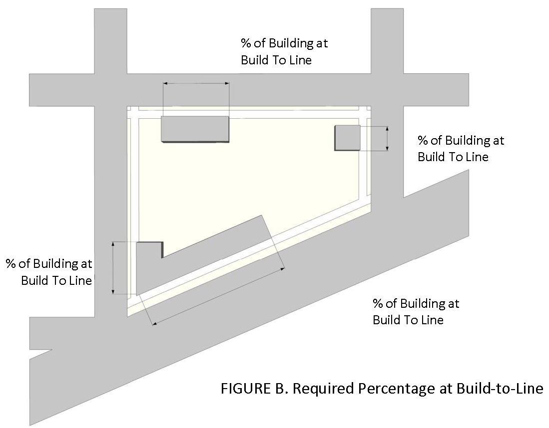 In commercial, retail or mixed-use areas, no front yard setback is required, provided the building fronts on a 12-foot wide minimum sidewalk. The minimum distance from the building line to the street or curb line is 12-foot.