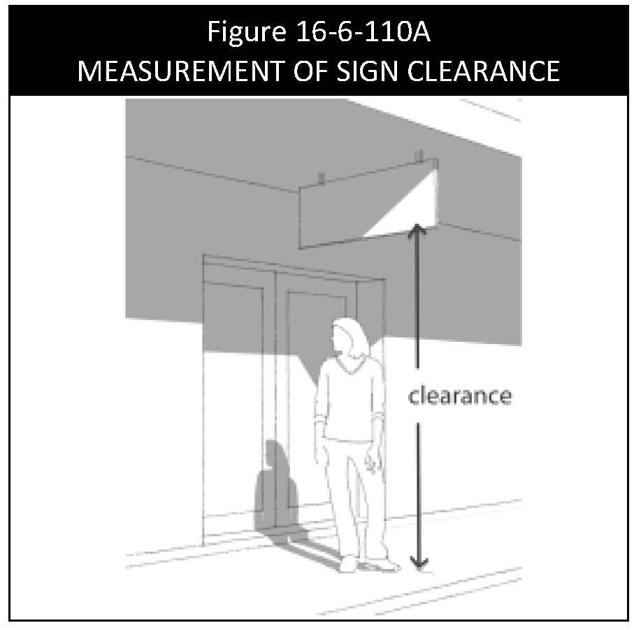 Sign clearance. Sign clearance is the distance between the bottom of a sign face or structural element that is not affixed to the ground and the nearest point on the ground-level surface under it. See Figure 16-6-110A, Measurement of Sign Clearance.