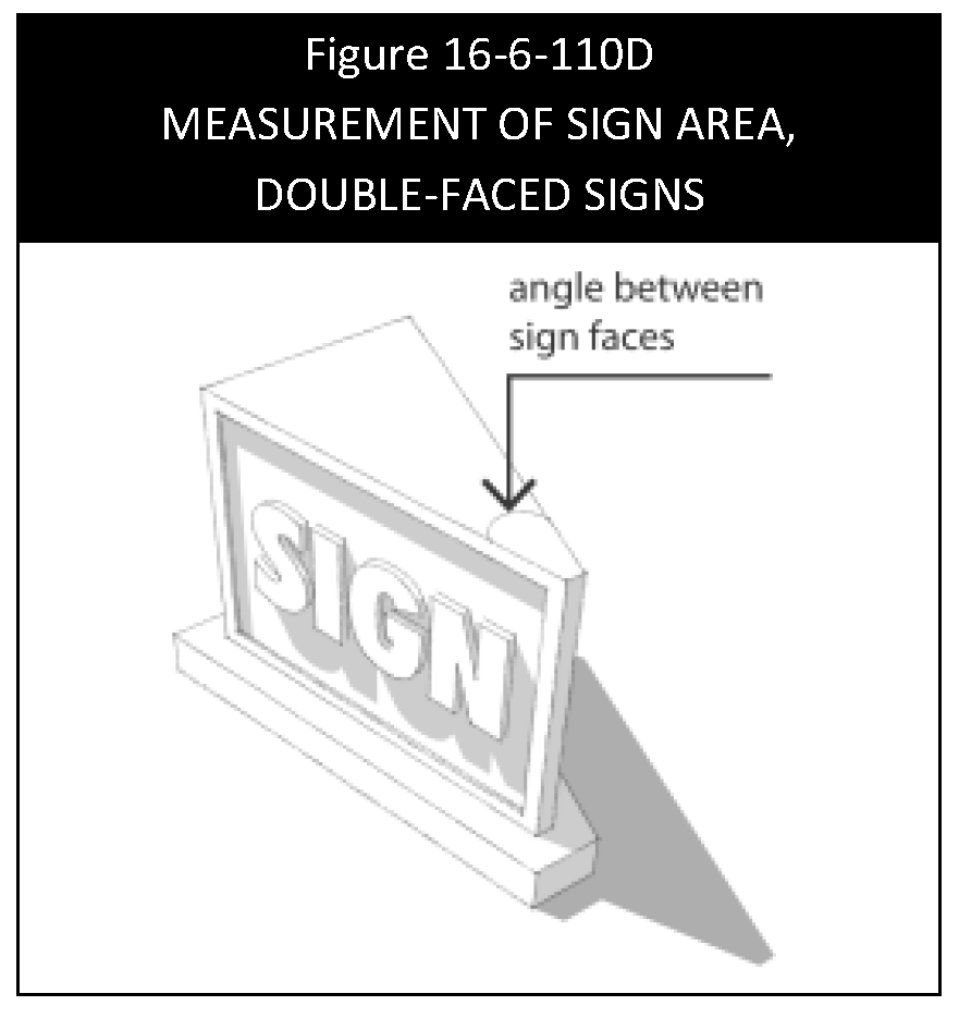 Double-faced signs. For projecting, suspended, freestanding or other double-faced signs, only one sign face is measured, provided that the sign faces are parallel or form an interior angle of less than 30 degrees and the sign faces are mounted on the same structure. If the sign faces are not equal in area, the larger sign face is measured. If the interior angle between the sign faces is more than 30 degrees, then both sign faces are measured. See Figure 16-6-110D, Measurement of Sign Area, Double-Faced Signs.
