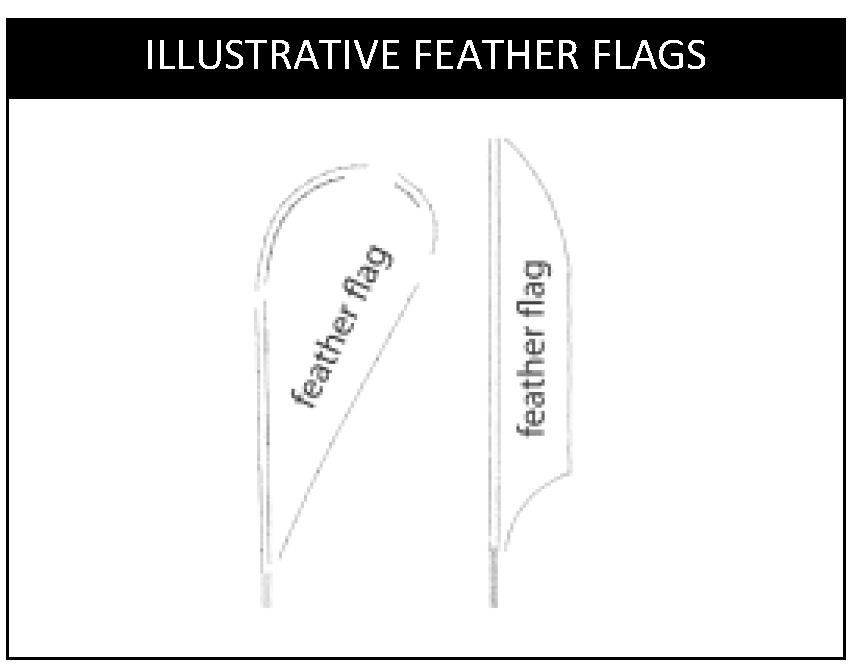Feather flag means a flag that is mounted on a temporary flagpole (e.g., a flagpole that is installed in a mount that is staked into the ground), which may be vertical, bowed or flexible. Feather flags do not include flags that are flown from permanent, vertical flagpoles.