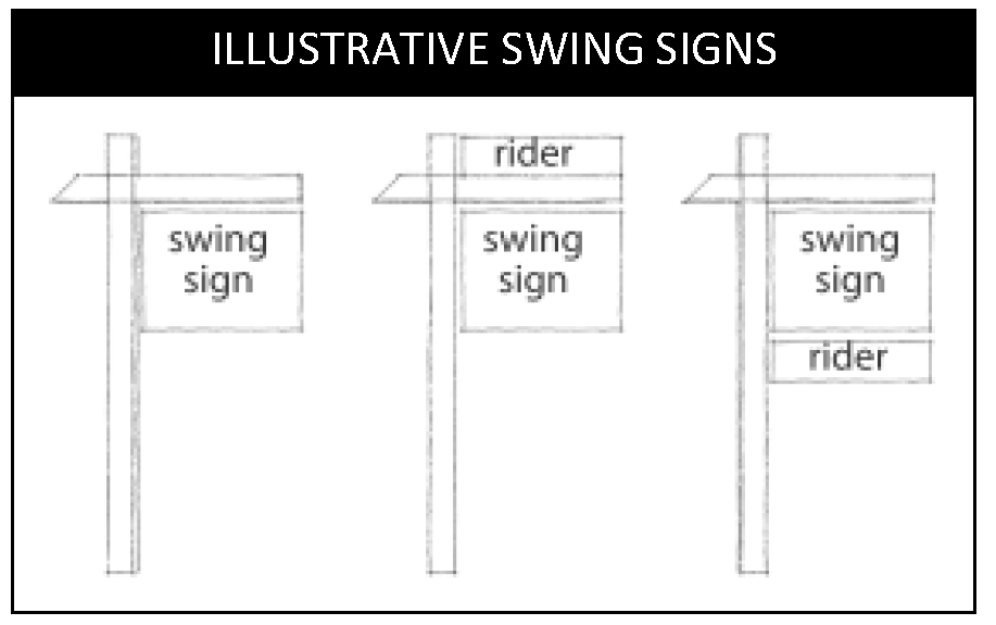Swing sign means a type of temporary sign that is suspended from a horizontal swing post attached to a post that is staked into the ground. Swing signs may include riders that are mounted to the swing post or suspended under the sign panel.