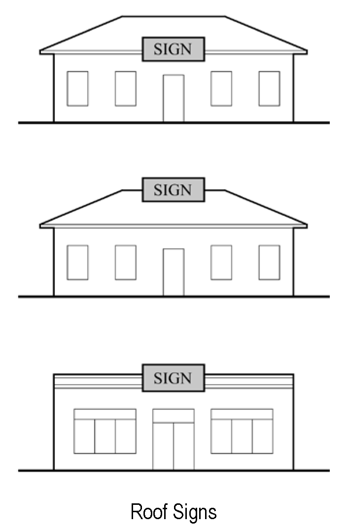 Roof sign means a sign that is mounted on the roof of a building or that is wholly dependent upon a building for support and which projects above the highest point of a building with a flat roof or the eave line of a building with a gambrel, gable or hip roof; or the deck line of a building with a mansard roof.