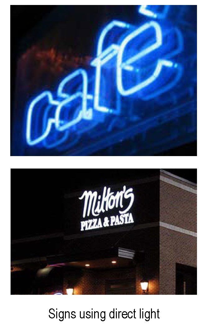 Direct light means one emitting light from a source within or affixed to the sign face and beaming outward from it.