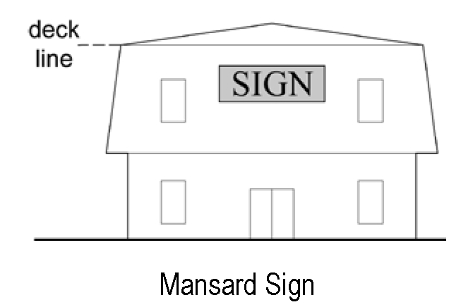Mansard sign means a sign integrated into a portion of a mansard roof or a mansard roof-like structure at the top of a wall and that does not extend above the deck line. For the purposes of these regulations, mansard signs are treated as attached signs and are not considered roof signs, unless the sign extends above the deck line.