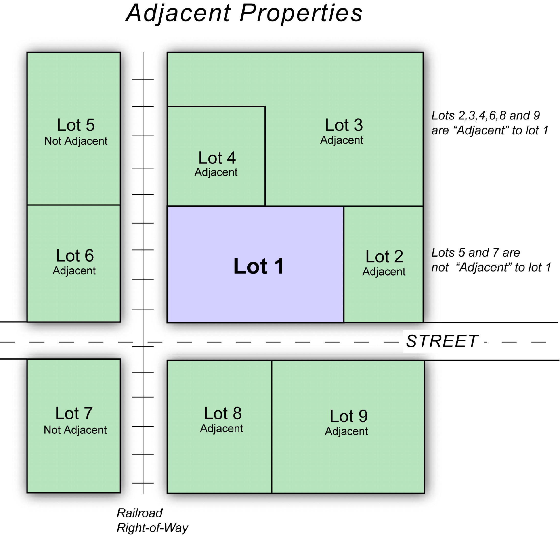 | Adjacent (Property (ies)) | One or more lots or tracts that abut or touch and having a boundary, or portion thereof, which is contiguous to the lot in question. Such determination shall be made by extending the exterior lot lines of the lot in question to adjacent lots and/or adjacent roads, streams, easements or rights-of-way. The term "adjacent" or "adjacent property" shall also mean "contiguous" or "contiguous property," "abutting" or "abutting property," "adjacent or adjacent property." An example of how this definition is to be applied is shown below: |